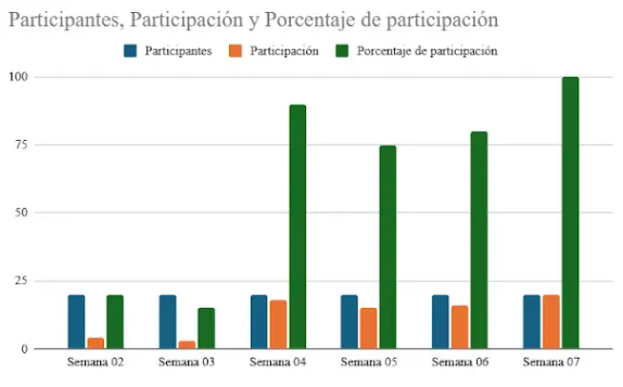 Podemos observar el cambio en la participación activa de los estudiantes semana a semana, actualmente, mantengo la participación en porcentajes altos y sobre todo están conectados y comprometidos durantes la sesión del curso.