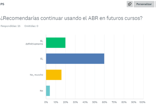 "Sí" es la respuesta más seleccionada, con una participación aproximada de más del 60% de los encuestados. Esto indica que la mayoría de los estudiantes están satisfechos con el uso del ABR y creen que debería seguir aplicándose en futuros cursos.