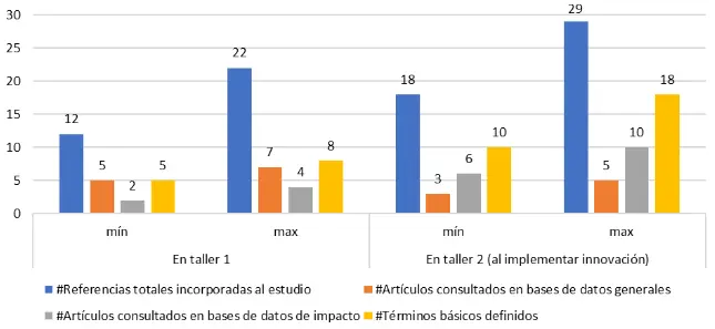 - El número de términos básicos definidos pasó de entre 5 y 8 a entre 10 y 18 (barra amarilla), esto pone en evidencia la mejora de redacción y citación de términos básicos de información incorporando la literatura consultada.